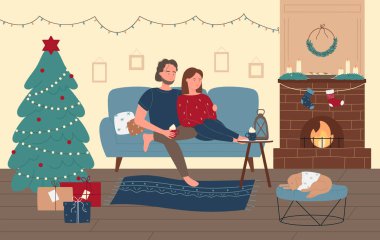 Living room with a fireplace decorated with christmas stockings and a wreath vector cartoon clipart.